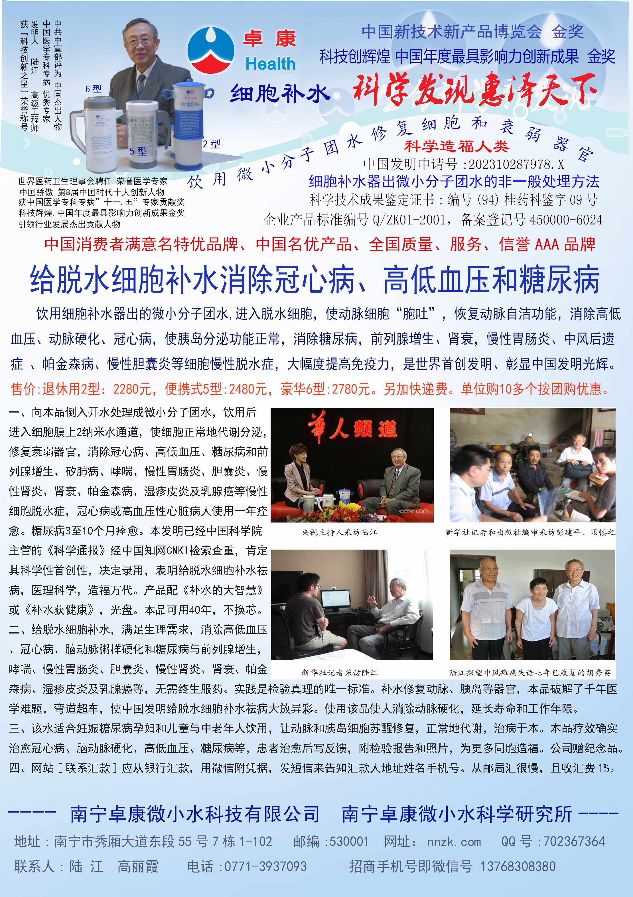 以上關于細胞膜通道的科學發現,為人類飲用微小分子團水奠定了生理學和醫學基礎,啟發人們給細胞補水,使衰弱器官恢復健康,讓冠心病、高血壓和糖尿病不藥而愈。而我是根據中國基礎醫學研究成果受啟發才搞的發明。22年來的實踐表明,人類對上述病癥將無需終生吃掩蓋癥狀的不治本的藥,也不應當再承受終身病痛。請各位看看我公司的網站(nnzk.com)。這是我國三萬多患者通過實踐而證實的成果,飲用后不僅治愈上述的三大病癥,同時降血脂、血黏度好。并因飲用微小分子團水容易進細胞膜上2納米的水通道,修復了細胞膜糖脂通道和閘門,使細胞代謝趨向正常,逐漸修復并增強了衰弱器官。同時修復和增強了胸腺和脾臟等免疫器官,產生了更多的免疫細胞,提高了免疫力,所以少生病或不生病,從而延緩衰老,延長壽命。說明微小分子團水有極為寶貴的醫療作用,表明了中國人已攻克世界醫學界的重大難題。人類幾千年不能用藥治愈的病,被中國發明產品處理出的微小分子團水治愈了,為人類開拓了求健康的新路!光榮屬于中國!